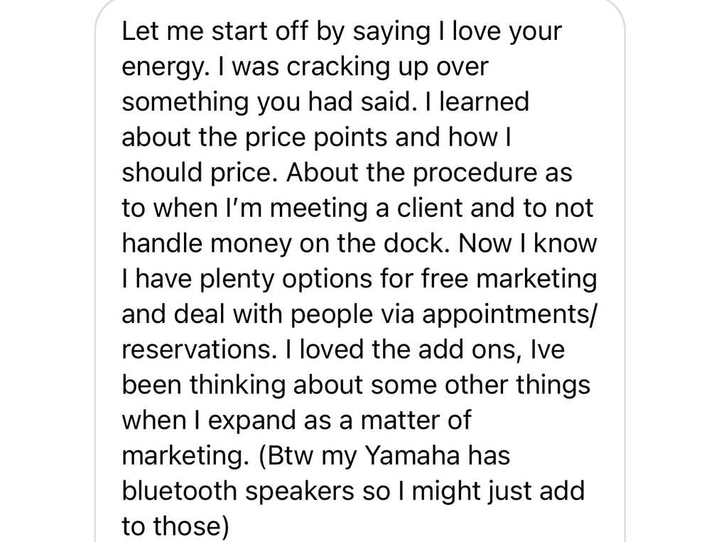 BOAT: "Bust Out Another Thousand" Welcome to the billion dollar boat rental industry. The price of entry to this information is not cheap, however think about how much money and time it's going to cost you to try to figure it all out yourself. Thousands down the drain when this is the best $1000 you'll ever spend to get into the industry and make your money back and see a return on your investment. I built my website myself and was in the top 7% of Shopify stores created last summer. The knowledge you'll receive in this mentorship from marketing, websites, SEO, jet ski and more is invaluable.